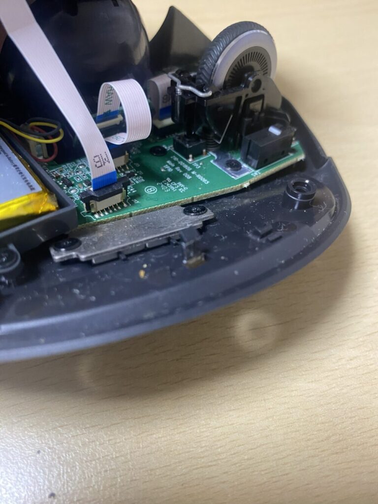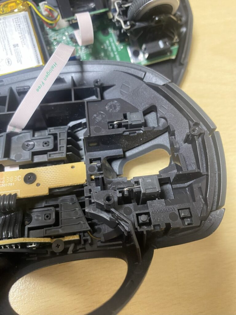 4. 左クリック部分を確認すると、小さな金属バネが外れているのを発見(めっちゃ小さい!)